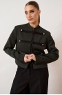 Жакет женский, укороченный, прямого силуэта, из плотной костюмной ткани в стиле милитари. Модель с воротником-стойкой и центральной бортовой застежкой (стык в стык) на потайные крючки или кнопки. Перед оформлен шестью декоративными горизонтальными патами из плетеного шнура, каждая из которых дополнена металлической пуговицей. Рукав втачной, двухшовный, классической длины. Изделие на притачной подкладке, плечевой пояс подчеркнут плечевыми накладками.