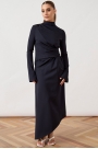 Платье женское приталенного силуэта, выполнено из плотного трикотажного полотна. Изделие с высоким воротником-стойкой и длинным втачным рукавом с закрытой проймой. Ключевой конструктивной особенностью модели является сложная драпировка на переднем полотнище, создающая эффект асимметричных складок, сходящихся к линии талии. Спинка платья с талиевыми вытачками и застежкой на потайную молнию. Нижний край изделия оформлен с выраженной асимметрией, где правая сторона платья длиннее левой, образуя мягкий диагональный срез. Линия низа обработана узким плоским швом.