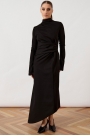Платье женское приталенного силуэта, выполнено из плотного трикотажного полотна. Изделие с высоким воротником-стойкой и длинным втачным рукавом с закрытой проймой. Ключевой конструктивной особенностью модели является сложная драпировка на переднем полотнище, создающая эффект асимметричных складок, сходящихся к линии талии. Спинка платья с талиевыми вытачками и застежкой на потайную молнию. Нижний край изделия оформлен с выраженной асимметрией, где правая сторона платья длиннее левой, образуя мягкий диагональный срез. Линия низа обработана узким плоским швом.
