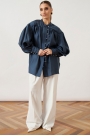 Блуза свободного силуэта (оверсайз) выполнена из струящейся плательной ткани. Модель с воротником-стойкой и центральной застежкой на ряд аккуратных жемчужных пуговиц и навесных петель. Особенностью конструкции является кокетка, переходящая в рукав, и глубокая густая сборка по линии груди и спинки, создающая объемный летящий силуэт. Плечевой пояс спущен, рукав втачной, экстремально объемный, формы «епископ», заканчивающийся высокой притачной манжетой на нескольких пуговицах. Нижний край блузы обработан узким швом вподгиб.
