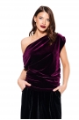 Блуза из бархата на трикотажной основе, умеренного объема, полуприлегающего силуэта с акцентом на одно плечо, с фигурной драпировкой на уровне груди. Вырез горловины в форме лодочки. Левый плечевой и боковой шов оформлены сборкой. Длина до линии бедер.