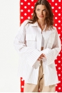 Блузка свободного объема, прямого силуэта, с центральной застежкой на обметанные петли и пуговицы. Воротник «рубашечный» стояче-отложной на отрезной стойке. Детали переда с накладными карманами с клапаном. Спинка с отрезной двойной кокеткой и декоративной шлевкой. Боковые швы заканчиваются разрезом. Рукав втачной, одношовный. Нижний срез рукава обработан притачной манжетой. Застежка манжеты на 1 обметанную петлю и 1 пуговицу.