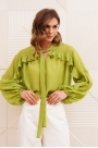 Блузка свободного силуэта из струящейся шифоновой ткани. Перед и спинка с кокеткой и сборкой. Рукав спущенный свободный с резинкой понизу. Вдоль линии кокетки и рукава вставлена рюша. Горловина V-образной формы с воротником стойкой переходящей в бант. Длина блузки - 67 см, длина рукава - 60 см. Обратите внимание! Данная модель прекрасно сочетается с другими моделями из нашей коллекции 35204 и 15377 в коричневом цвете. Создайте гармоничный образ, комбинируя эти изделия!