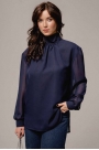 Блузка из шифона, прямого силуэта. С застежкой по спинке на петли-пуговицы, рукав рубашечного типа на притачной манжете. Перед двойной со сборкой по линии горловины, спинка с кокеткой. Воротник стойка.