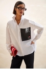 - слева накладной карман контрастного цвета с принтом и брошкой;