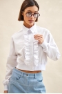 Блуза:- О-силуэт;- спущенная линия плеча;- застежка на планку с пуговицами и двумя оборками вдоль пл...