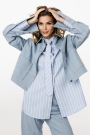 Блузка выполнена из плотного джинса. Блузка прямого силуэта, длиной ниже линии талии. Спереди накладные карманы и центральная застежка с планкой на пробивные пуговицы. На спинке кокетка и две складки. Воротник стояче-отложной с отрезной стойкой. Плечевой шов удлинен. Рукав рубашечного покроя, одношовный. Низ рукава на притачной манжете с застежкой на пробивные пуговицы. Рукав удлинен. Блузка декорирована по кокетке спинки нашивкой из натуральной кожи.