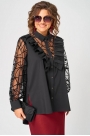 Блуза шикарная женская элегантная нарядная свободного силуэта выполнена из хлопка в сочетании с гипюром (сеткой с флоком). Вырез горловины воротник на стойке рубашечного типа, рукав втачной из гипюра (сетки) по низу на сборке и притачной манжете. Застежка доверху на обметанные петли и пуговицы. По полочке фигурные вставки из гипюра (сетки) с притачной рюшей с двух сторон. Рюша входит в плечо. В боковых швах обработаны разрезы. Низ блузы фигурный. Декором блузы служит дизайн гипюра (сетки) и рюши со сборкой.
