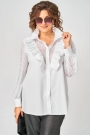 Блуза шикарная женская элегантная нарядная свободного силуэта выполнена из хлопка в сочетании с гипюром (сеткой с флоком). Вырез горловины воротник на стойке рубашечного типа, рукав втачной из гипюра (сетки) по низу на сборке и притачной манжете. Застежка доверху на обметанные петли и пуговицы. По полочке фигурные вставки из гипюра (сетки) с притачной рюшей с двух сторон. Рюша входит в плечо. В боковых швах обработаны разрезы. Низ блузы фигурный. Декором блузы служит дизайн гипюра (сетки) и рюши со сборкой.