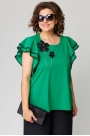 Блуза прямого силуэта с фигурным низом, выполнена из хлопка. Вырез горловины круглый на обтачке, рукава втачные двойные "крылышки". В боковых швах обработаны разрезы. Декором служит контрастная окантовка на рукавах и съемная отделочная брошь в виде двух цветов с цепочкой.