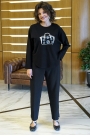 Блузон прямого, свободного силуэта, боковые части переда и спинки с цельнокроеными, длинными рукавами, с фигурной линией низа. С бейкой по горловине. Декорирован аппликацией «вышивка» и отделочными деталями со стразами. Брюки типа «банан», длиной 7/8, с разно-уровневым низом и конструктивными выточками, на притачном поясе со шлёвками, по спинке на резинке. Застёжкой типа «гульфик» на молнию и петлю, пуговицу по краю пояса. Передние части с полукруглыми боковыми карманами. Задние части с притачной кокеткой и накладными карманами.