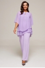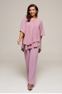 Нарядный комплект, состоящий из блузки и брюк.Данная модель выполнена из двух видов ткани.Блузка свободного кроя из легкой, струящейся шифоновой ткани.Передняя часть блузы с двойным слоем ткани, цельнокроеная, с декоративными, мягко драпирующимися складками, уходящими в обтачку горловины.Задняя часть двойная, цельная, с разрезом – «капелькой» в верхней части.Рукав«реглан», широкий, свободный. Горловина округлой формы на обтачке.Сзади предусмотрена дополнительная застежка на две маленькие, декоративные пуговицы.Свободный силуэт блузки отлично драпируется на фигуре.Нижний край блузы неровный.Брюки классического кроя, стандартной длины.Высота посадки стандартная, средне - высокая. Застежка центральная на молнию с пуговицей.В верхней части бокового шва предусмотрены функциональные карманы.Задняя часть пояса брюк на резинке, что придает изделию дополнительный комфорт при носке.Длина блузки (по среднему шву спинки) –81см.Длина рукава (рукав + плечо)– 42см.Длина брюк –103см.