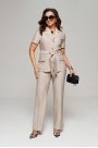 Брюки длинные, классические, с высокой посадкой. В верхней части бокового шва брюк расположены функциональные карманы. Застежка центральная на молнию с пуговицей.