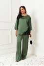 Изысканный костюм состоит из 2-ух предметов: блузки и брюк. Выполнен из атласного полотна в сочетании с кружевом. Основная ткань нежная, гладкой фактуры, приятная на ощупь и с блестящей поверхностью, она легко драпируется и очень выгодно и дорого подчёркивает образ; отделочная ткань придает праздничный шарм.
