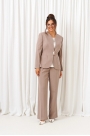 Комплект женский 3-ка, состоящий из жакета, брюк и блузки. Предназначен для повседневного использования. Жакет и брюки выполнены из костюмной ткани высокого качества нежной фактуры, приятной на ощупь, и актуального дизайна в полоску. Блузка изготовлена из вискозного полотна с содержанием натуральных волокон.Жакет полуприлегающего силуэта классического типа.Перед с вертикальными рельефами от проймы и функциональными накладными карманами. Спинка с центральным швом и с вертикальными рельефами от проймы. Рукав втачной двухшовный длинный.Горловина мягкой V-образной формы с закругленными краями, переходящая в застежку. Застежка центральная на декоративную пуговицу. Нижняя часть борта закругленная.Брюки прямого силуэта классической посадки, длинные, с двумя верхними боковыми карманами и двумя заложенными глубокими складками от пояса.Высота сиденья классическая. Застежка центральная на молнию и на две петли и пуговицы на поясе. В задней части пояса для удобного прилегания по талии вставлена резинка. Блузка полуприлегающего силуэта. Горловина округлой формы. В боковых швах снизу разрезы.Перед цельный, с двумя нагрудными выточками от бокового шва.Спинка разрезная по среднему шву с двумя выточками на уровне талии. В верхней части среднего шва предусмотрен небольшой разрез с фиксацией на одну навесную петлю и пуговицу. Длина жакета (по среднему шву спинки) ~ 65 см. Длина рукава жакета (от спущенного плеча) ~ 61,5 см Длина брюк (по боковому шву с поясом) ~ 109 см. Длина блузки (по среднему шву спинки) ~ 61 см. Длина жакета (по среднему шву спинки) ~ 65 см. Длина рукава жакета (от спущенного плеча) ~ 61,5 см Длина брюк (по боковому шву с поясом) ~ 109 см. Длина блузки (по среднему шву спинки) ~ 61 см.
