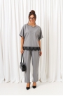 Костюм состоит из 2 предметов одежды: блузона и брюк. Выполнен из костюмной ткани стильного дизайна в полоску.