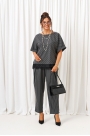 Костюм состоит из 2 предметов одежды: блузона и брюк. Выполнен из костюмной ткани стильного дизайна в полоску.