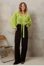 Блузка свободного силуэта из струящейся шифоновой ткани. Перед и спинка с кокеткой и сборкой. Рукав спущенный свободный с резинкой понизу. Вдоль линии кокетки и рукава вставлена рюша. Горловина V-образной формы с воротником стойкой переходящей в бант.