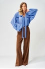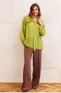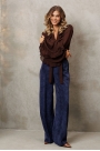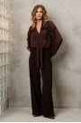 Брюки палаццо с притачным поясом из мягкой вельветовой ткани. Спереди застежка гульфик на молнии и петлей и пуговицей по поясу. По задней частям брюк вытачки. Пояс с резинкой в боковых частях. Брюки с заутюженными стрелками.