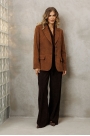 Жакет полуприлегающего силуэта из мягкой вельветовыой ткани приятного каштанового цвета. Застежка однобортная на две пуговицы, воротник пиджачного типа. Перед с талиевой вытачкой, рельефом и декоративным клапаном. Спинка с рельефами из проймы и средним швом. Рукав втачной двухшовный. Жакет на подкладке.
