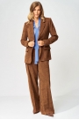 Жакет полуприлегающего силуэта из мягкой вельветовой ткани приятного каштанового цвета. Застежка однобортная на две пуговицы, воротник пиджачного типа. Перед с талиевой вытачкой, рельефом и декоративным клапаном. Спинка с рельефами из проймы и средним швом. Рукав втачной двухшовный. Жакет на подкладке.