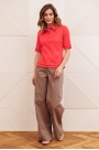 Джемпер приталенного силуэта с воротником поло из трикотажного полотна. Рукав втачной одношовный. Брюки палаццо с притачным поясом из мягкой вельветовой ткани. Спереди застежка гульфик на молнии и петлей и пуговицей по поясу. По задней частям брюк вытачки. Пояс с резинкой в боковых частях.