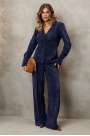 Брюки палаццо с притачным поясом из мягкой вельветовой ткани. Спереди застежка гульфик на молнии и петлей и пуговицей по поясу. По задней частям брюк вытачки. Пояс с резинкой в боковых частях. Брюки с заутюженными стрелками.