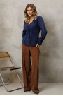 Брюки палаццо с притачным поясом из мягкой вельветовой ткани. Спереди застежка гульфик на молнии и петлей и пуговицей по поясу. По задней частям брюк вытачки. Пояс с резинкой в боковых частях. Брюки с заутюженными стрелками.