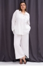 Льняной комплект, состоящий из объёмной рубашки и прямых брюк.