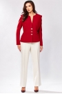 Костюм состоящий из жакета и брюк. Жакет полуприлегающего силуэта. По полочке и спинке расположена отлетная кокетка, по низу изделия баска. Рука длинный с открытым плечом. Структурированные плечи. Застежка на петли пуговицы. Жакет без подкладки. Низ изделия подшит на плоскошовной мшине. Брюки прямого силуэта с отсрочеными кантами на 0.2 см по переднему и заднему полотнищу. На переднем полотнище брюк расположены карманы. Верх пояса обработан поясам с резинкой, в пояс вставлен декоративный шнурок с наконечниками. Низ брюк обработан швом с открытым срезом.