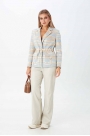 Однобортный жакет на подкладке прямого силуэта с застёжкой на две петли и пуговицы. По талии расположена кулиса и шнурок для приталивания жакета. По переду расположены накладные карманы с клапаном и декором.