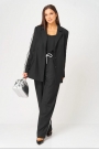 Жакет: – свободный силуэт – на подкладке – рукав одношовный, спущенный (тесьма) – по спинке шлица – застёжка петли-пуговицы – однобортный – перед с прорезными карманами с листочками – воротник пиджачного типа Брюки: – прямой силуэт – пояс с эластичной тесьмой – карманы в боковых швах – декоративный шнурок в поясе