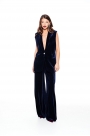 Брюки из бархата на трикотажной основе, свободного объема, расширенные к низу. На передних половинках выполнены боковые карманы с отрезным бочком и встречные складки. На задних половинках талиевые вытачки. Застежка – гульфик на молнии. Пояс притачной, с резинкой по спинке, застежкой на крючок и потайную пуговицу.