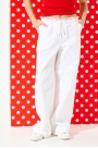 Брюки свободного объема, прямые. Застежка-гульфик на молнии. На передних половинках карманы с отрезным бочком и вытачки на уровне колена. На задних половинках брюк талиевые вытачки и накладные карманы. Пояс обработан обтачкой с отделочной строчкой, образующей кулиску, в которую продет декоративный шнур-завязка с наконечниками. Верхний срез пояса с вставкой из кружева. Пояс с застежкой на 1 петлю и 1 пуговицу.