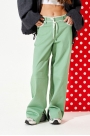 Брюки свободного объема, прямого силуэта. Застежка-гульфик на молнии. На передних половинках карманы с отрезной боковой частью. Задние половинки с притачной кокеткой и накладными карманами. Детали переда и спинки с горизонтальными подрезами на уровне колен. Пояс притачной, с застежкой на 1 обметанную петлю и пуговицу. Пояс с двойными шлевками. В шлевки продет декоративный шнур с наконечниками. Пояс и карманы на передних половинках брюк оформлены тесьмой из кружева.