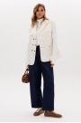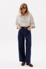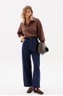 Джинсы-багги выполнены из плотного джинса. Брюки на притачном поясе, длиной до линии щиколотки, расширенные от бедер и слегка зауженные к низу. Спереди боковые карманы с фигурным входом. Застежка на пуговицу и молнию с гульфиком. На задних частях кокетки и накладные карманы. На передней и задней части коленные вытачки.