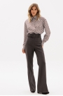 Брюки выполнены из костюмной ткани. Брюки покроя "клеш", на притачном поясе, длиной в пол. Спереди застежка на молнию с гульфиком, потайную пуговицу и два брючных крючка. Передние и задние части брюк заутюжены на кант. В комплект входит съемный пояс из основной ткани.