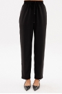 Брюки выполнены из костюмной ткани. Брюки зауженные к низу, длиной 7/8, на притачном поясе с эластичной тесьмой. Спереди боковые карманы с наклонным входом, петли в поясе, в которые втянут шнур из основной ткани.