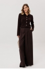Брюки-палаццо выполнены из плательно-костюмной ткани. Брюки на притачном поясе, длиной в пол, расширенные к низу. Спереди складки и боковые карманы с наклонным входом. Застежка спереди на молнию с гульфиком и пуговицу. На задних частях обработаны талиевые вытачки.