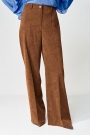 Брюки палаццо с притачным поясом из мягкой вельветовой ткани. Спереди застежка гульфик на молнии и петлей и пуговицей по поясу. По задней частям брюк вытачки. Пояс с резинкой в боковых частях. Брюки с заутюженными стрелками.