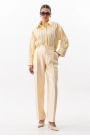 Брюки актуального силуэта, свободные, слегка заужны к низу. На передних половинках заутюжены стрелки, переходящие в складки по линии талии. Застежка-гульфик, по переду боковые наклонные карманы. Пояс стабильный по переду, по задней части брюк на резинке, с настроченными шлевками и застежкой на пуговичку. Длина брюк по боковому шву с поясом 107 см.