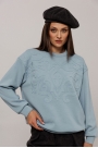 Джемпер из технологичного трикотажного полотна с эффектом peach. Прямого силуэта с втачным рукавом и спущенной линией плеча, с манжетой из основной ткани по низу рукава. По переду вышивка 'Орнамент'. По горловине и низу изделия притачная планка из основной ткани.