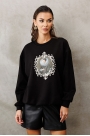 Джемпер из технологичного трикотажного полотна с эффектом peach. Прямого силуэта с втачным рукавом и спущенной линией плеча, с манжетой из отделочной ткани по низу рукава. По переду печать с вышивкой 'Queen'. По горловине и низу изделия притачная планка из отделочной ткани.