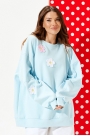 Свитшот из трикотажного полотна, свободного объема, прямого силуэта, с круглым вырезом горловины. Перед цельный. Спинка с отрезной декоративной деталью. Рукав втачной, двухшовный, с горизонтальным подрезом на уровне линии локтя. Низ рукава обработан притачной манжетой. По переду, на декоративной детали спинки и деталях рукавов выполнена вышивка «Цветы».