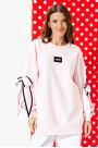 Свитшот из трикотажного полотна свободного объема, прямого силуэта, с круглым вырезом горловины. Перед и спинка цельные. Перед декорирован настрочной нашивкой. Рукав втачной, одношовный, длинный. Рукав декорирован настрочной деталью, в которую продет декоративный бант из основного материала. Края банта и рукав оформлены декоративной тесьмой. Низ изделия и рукава обработаны притачной манжетой.
