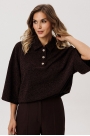 Джемпер выполнен из трикотажного полотна с блеском. Джемпер О-образного силуэта, длиной выше линии бедер. Спереди центральная застежка на декоративные пуговицы. Спинка цельная. Воротник стояче-отложной. Плечевой шов удлинен. Рукав рубашечного покроя, одношовный, длиной до линии локтя. Низ джемпера присобран на эластичную тесьму.