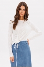 Полуприлегающий силуэт, втачной покрой, круглая горловина, длинный зауженный рукав. По низу джемпера с одной стороны декоративная сборка.