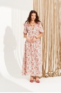 Платье полуприлегающего силуэта, расклешенное книзу, отрезное по линии талии, с V-образным вырезом горловины и застежкой на тесьму-молнию в среднем шве спинки. Перед с отрезным лифом. Спинка со средним швом и отрезным поясом со сборкой на эластичную тесьму. Рукав втачной короткий, со сборкой по верхнему и нижнему срезам. Нижний срез рукава на резинке, дополнен декоративными завязками.