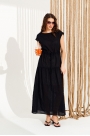 Платье умеренного объема, приталенного силуэта, отрезное по линии талии, со спущенной линией плеча и подъюбником из хлопковой подкладки. Нижний срез переда и спинки оформлен воланами. Приталенность регулируется кулиской со шнуром-завязкой и наконечниками.