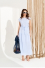 Платье умеренного объема, приталенного силуэта, отрезное по линии талии, со спущенной линией плеча и подъюбником из хлопковой подкладки. Нижний срез переда и спинки оформлен воланами. Приталенность регулируется кулиской со шнуром-завязкой и наконечниками.